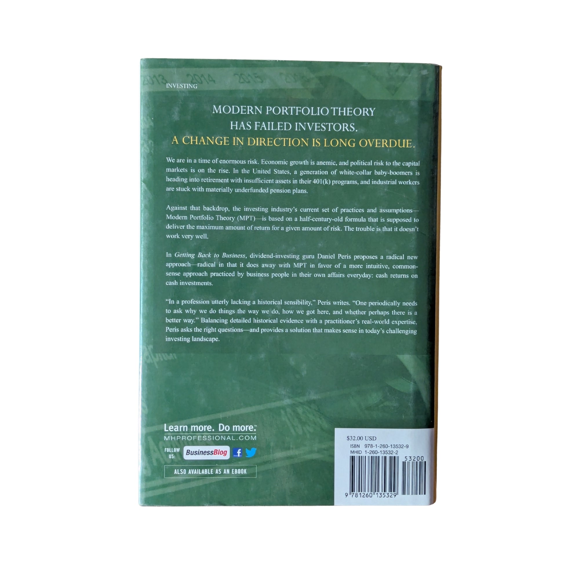 Modern Portfolio Theory has failed investors. A change in direction is long overdue. We are in a time of enormous risk. Economic growth is anemic, and political risk to the capital markets is on the rise. In the U.S., a generation of white collar baby-boomers is heading into retirement with insufficient assets in their 401(k) programs, and industrial workers are stuck with materially underfunded pension plans. Against that backdrop, the investing industry’s current set of practices and assumptions—Modern Portfolio Theory (MPT)—is based on a half-century old formula that is supposed to deliver the maximum amount of return for a given amount of risk. The trouble is that it doesn’t work very well. In Getting Back to Business, dividend-investing guru Daniel Peris proposes a radical new approach—radical in that it does away with MPT in favor of a more intuitive, common-sense approach practiced by business people in their own affairs everyday: cash returns on cash investments. “In a profession utterly lacking a historical sensibility,†Peris writes. “One periodically needs to ask why we do things the way we do, how we got here, and whether perhaps there is a better way.†Balancing detailed historical evidence with a practitioner’s real-world expertise, Peris asks the right questions—and provides a solution that makes sense in today’s challenging investing landscape.