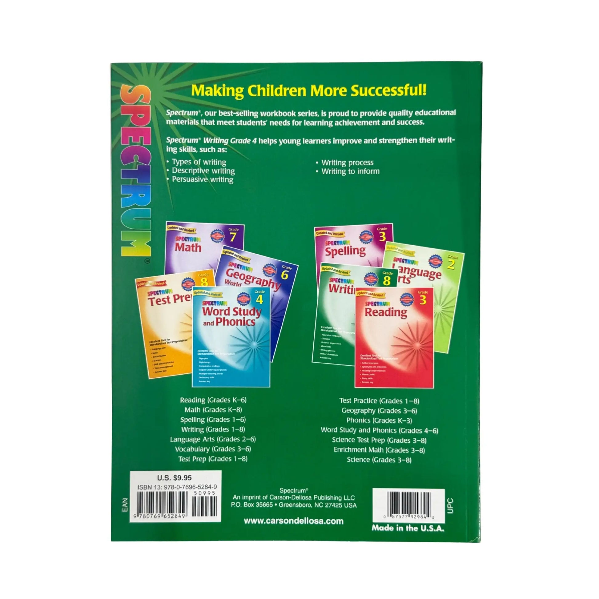 Spectrum Writing creates student interest and sparks writing creativity! The lessons, perfect for students in grade 4, strengthen writing skills by focusing on descriptive writing, persuasive writing, writing to inform, and more! Each book provides an overview of the writing process, as well as a break down of the essential skills that build good writing. It features easy-to-understand directions, is aligned to national and state standards, and also includes a complete answer key.